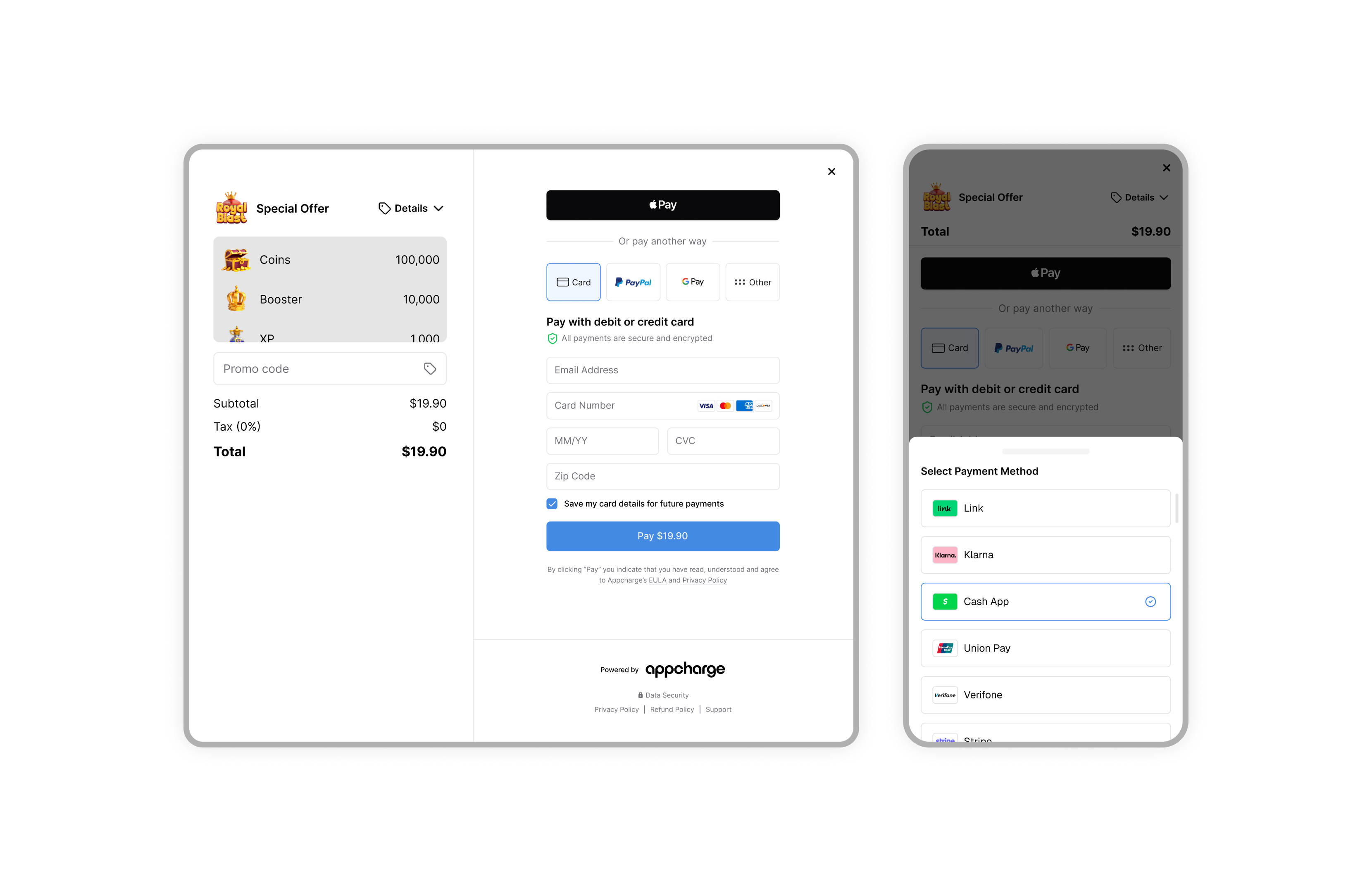 - Appcharge Webstore Checkout: This variation connects directly to the Appcharge-provided webstore, offering a seamless solution for managing in-app purchases and transactions. It handles all elements of the purchase flow from storefront to payment.