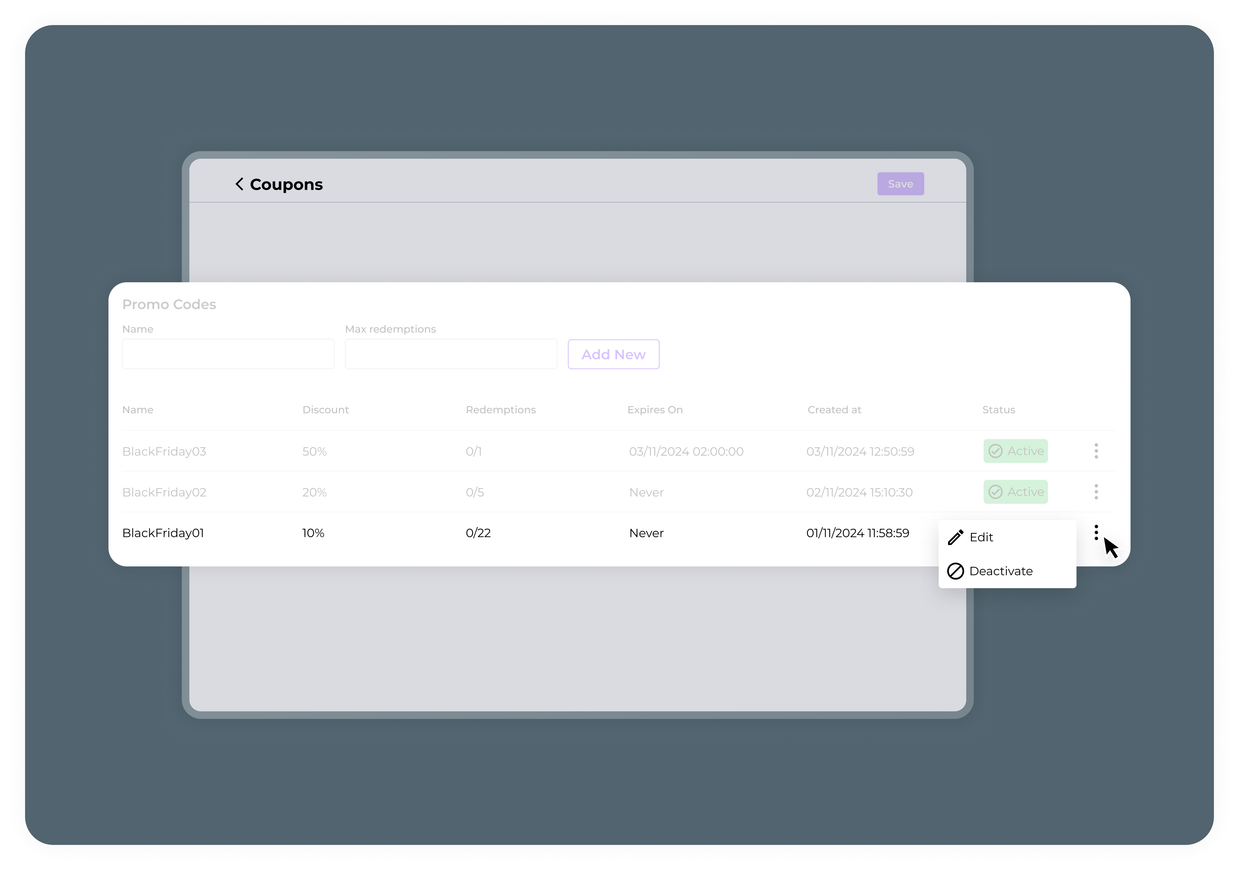 - Click the ellipsis next to the coupon you want to edit, and select Edit.