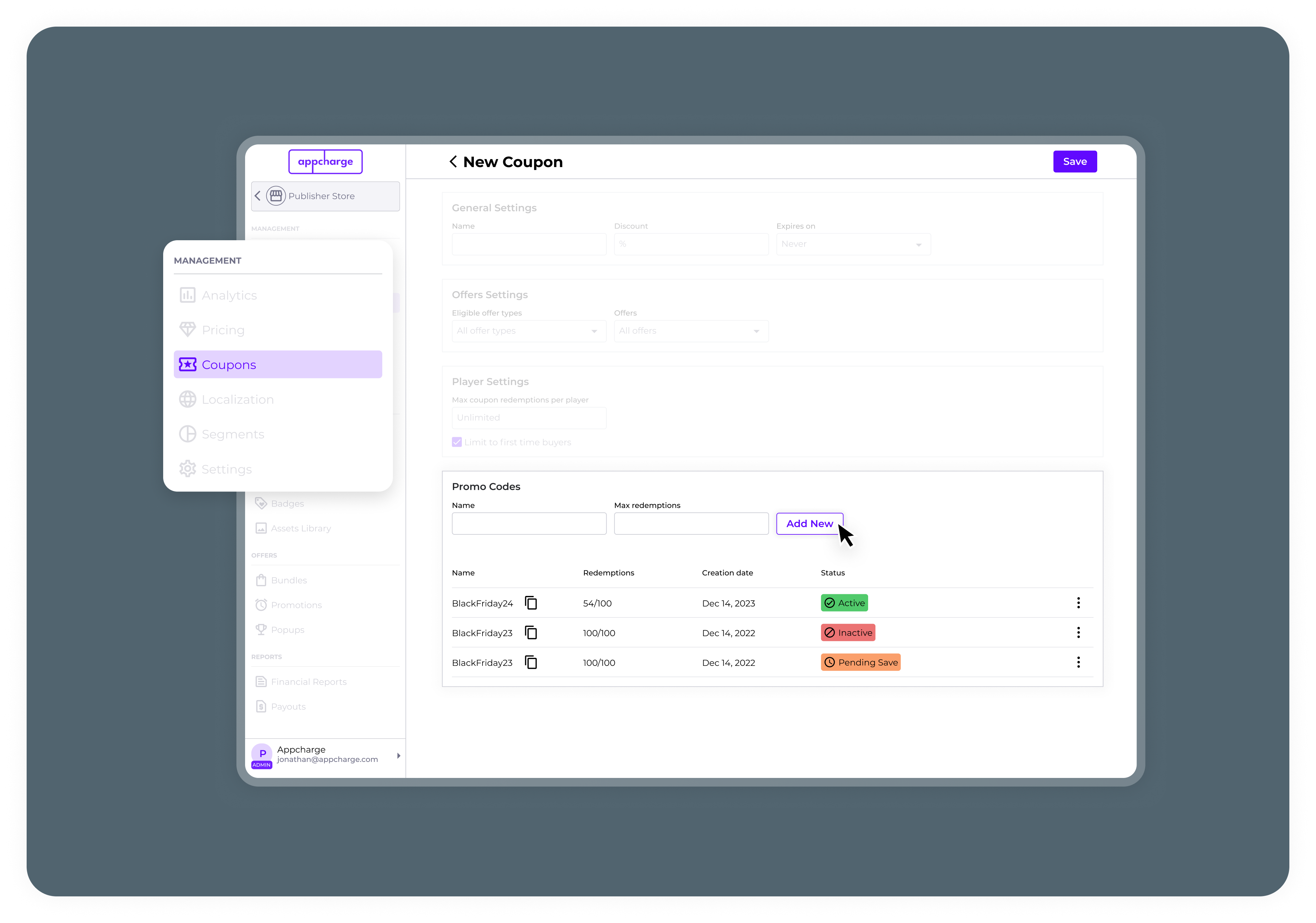 - Promo codes will display a Pending Save status until the coupon configuration is saved.
