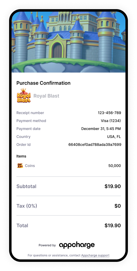 Skip to main contentAppcharge automatically sends a customized receipt after each purchase. These receipts are tailored to your game’s branding and provide players with essential information about their purchase.