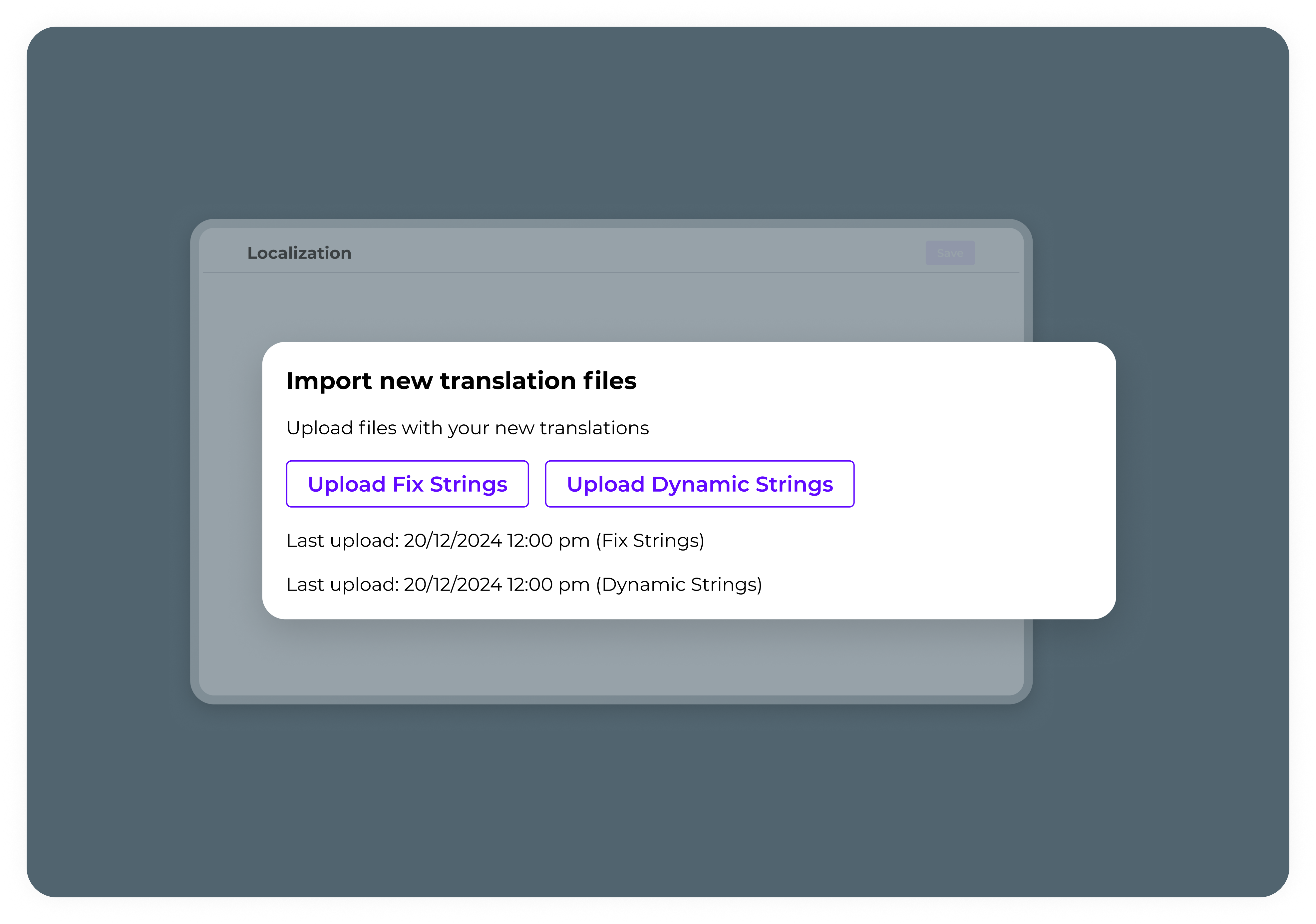 Once the translations are added, the publisher can upload the files back into the system:- Upload Static Strings: Upload the CSV with translations for buttons, labels, and other static content.