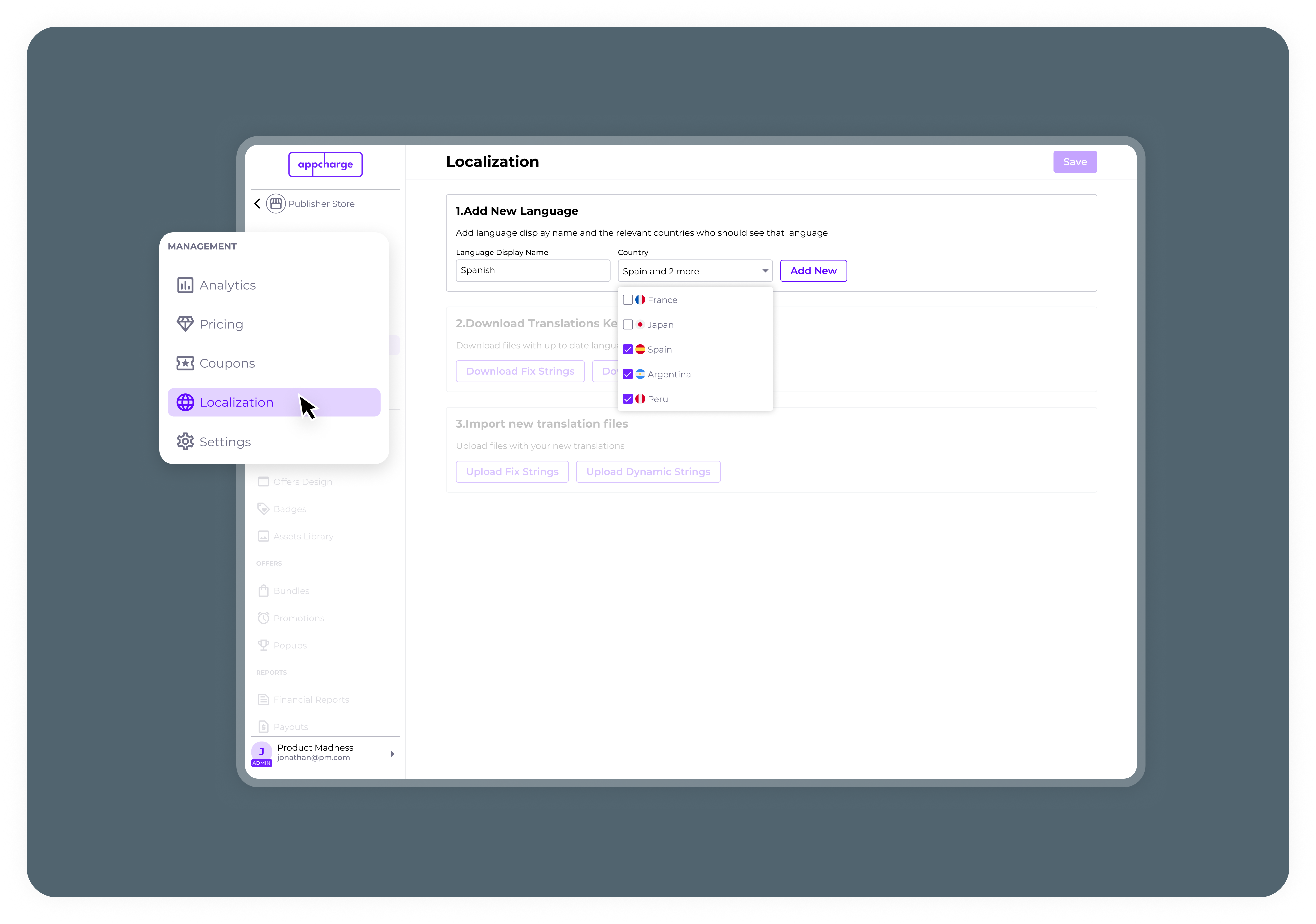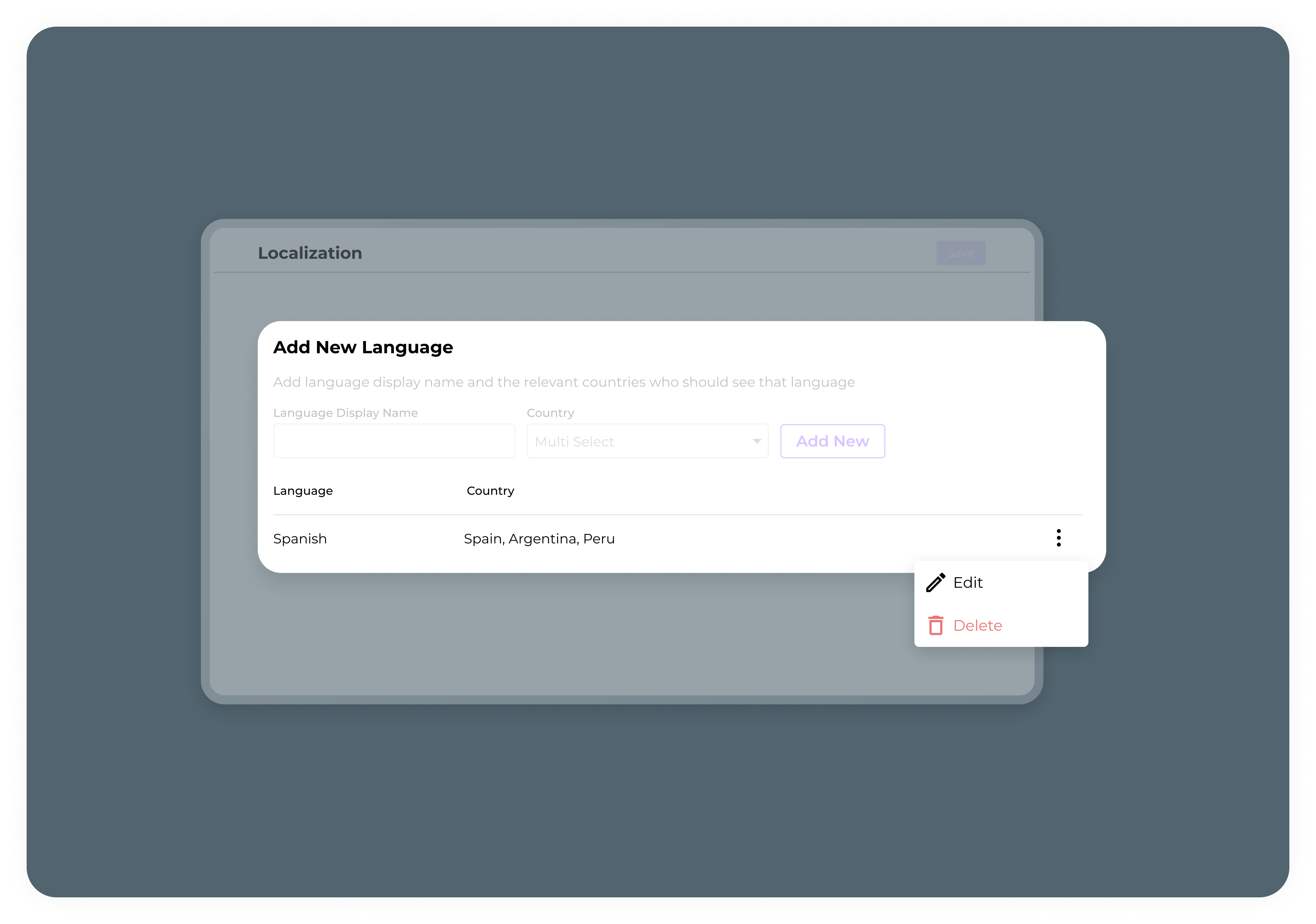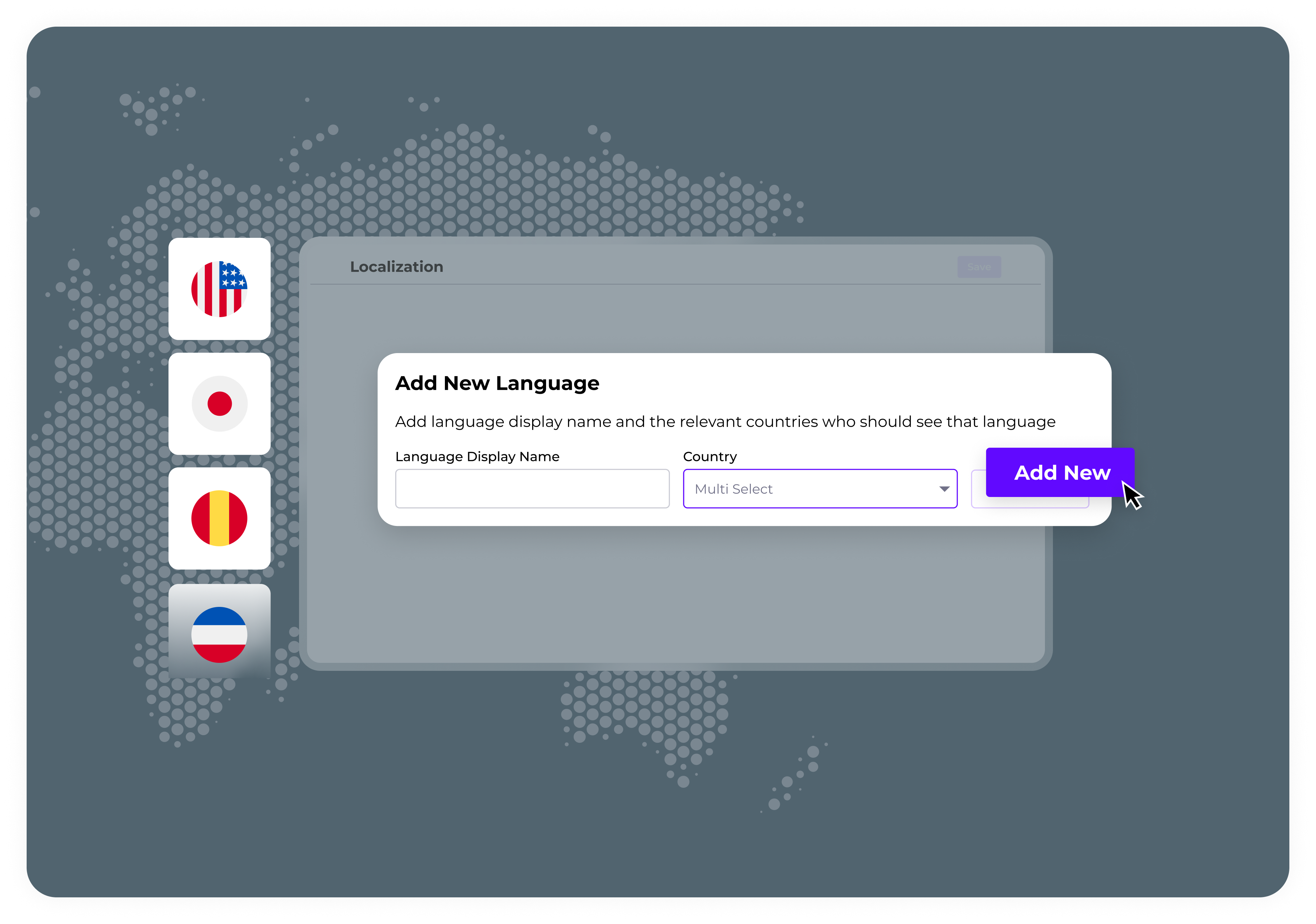 - Publisher Adds Language(s): Publishers define the display name, language code, and the countries for the language they want to localize.