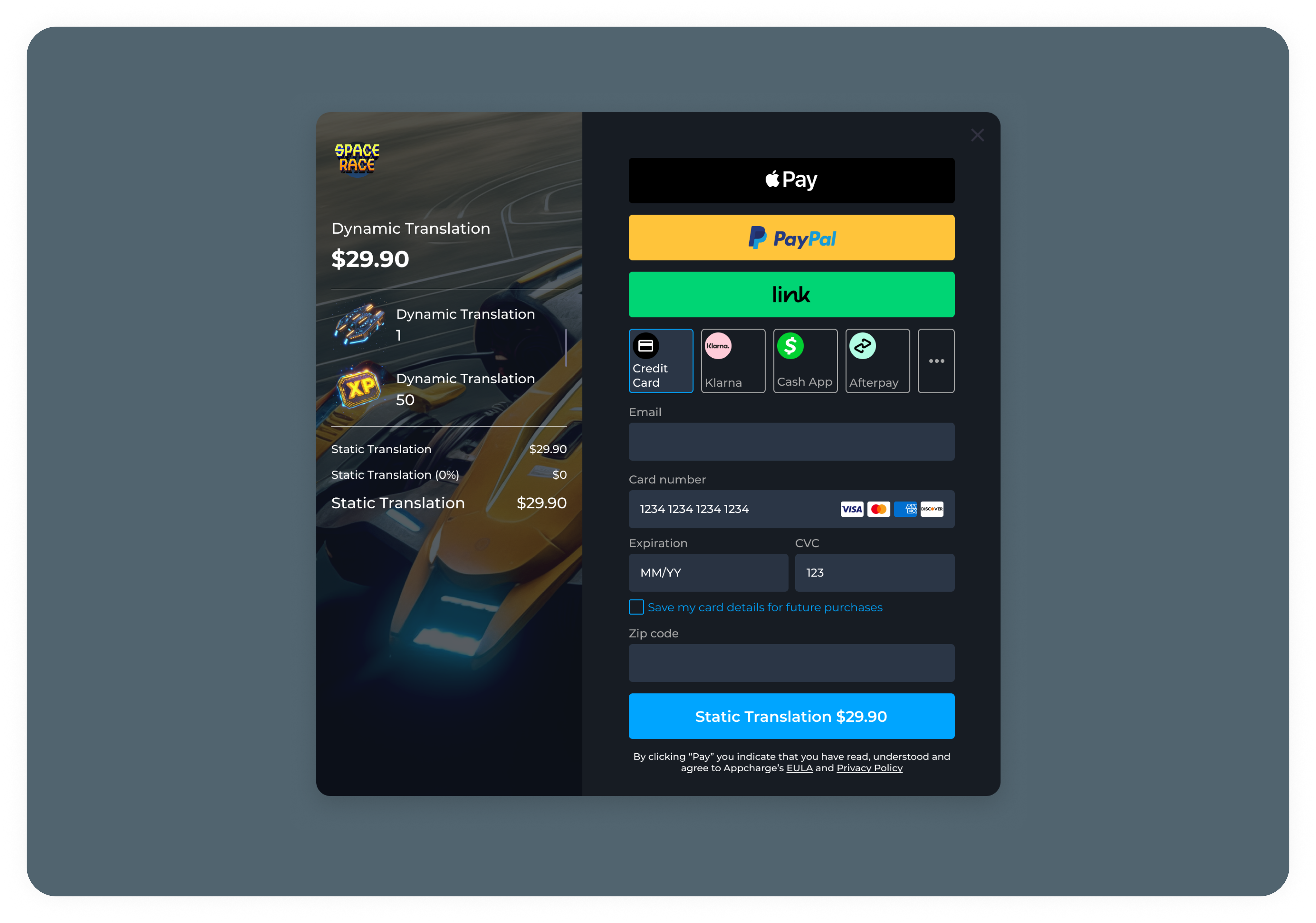Once the publisher uploads translations, the webstore and checkouts interface updates in real time, and the player’s language selection is applied to both static and dynamic text. ie: Checkout and webstore footer with localized translation texts