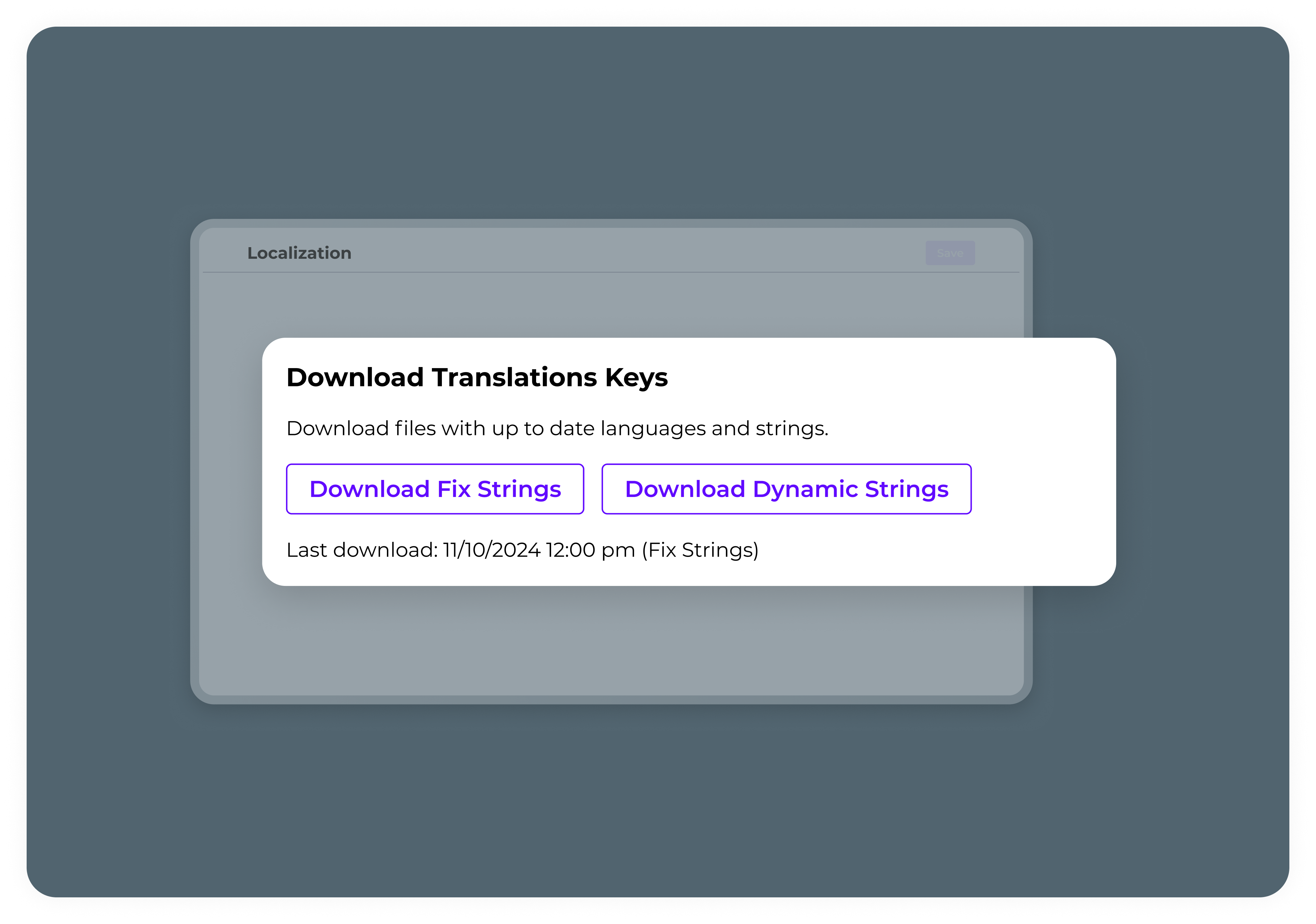 After adding a language, the publisher must download translation files to fill in the relevant text:- Download Static Strings: Download a CSV containing static content like buttons and footer text. These static strings, such as support menu items and button labels, are predefined by Appcharge. Each key in the file corresponds to a piece of static text, and it is recommended that publishers provide translations for these in the new language to ensure a consistent user experience.