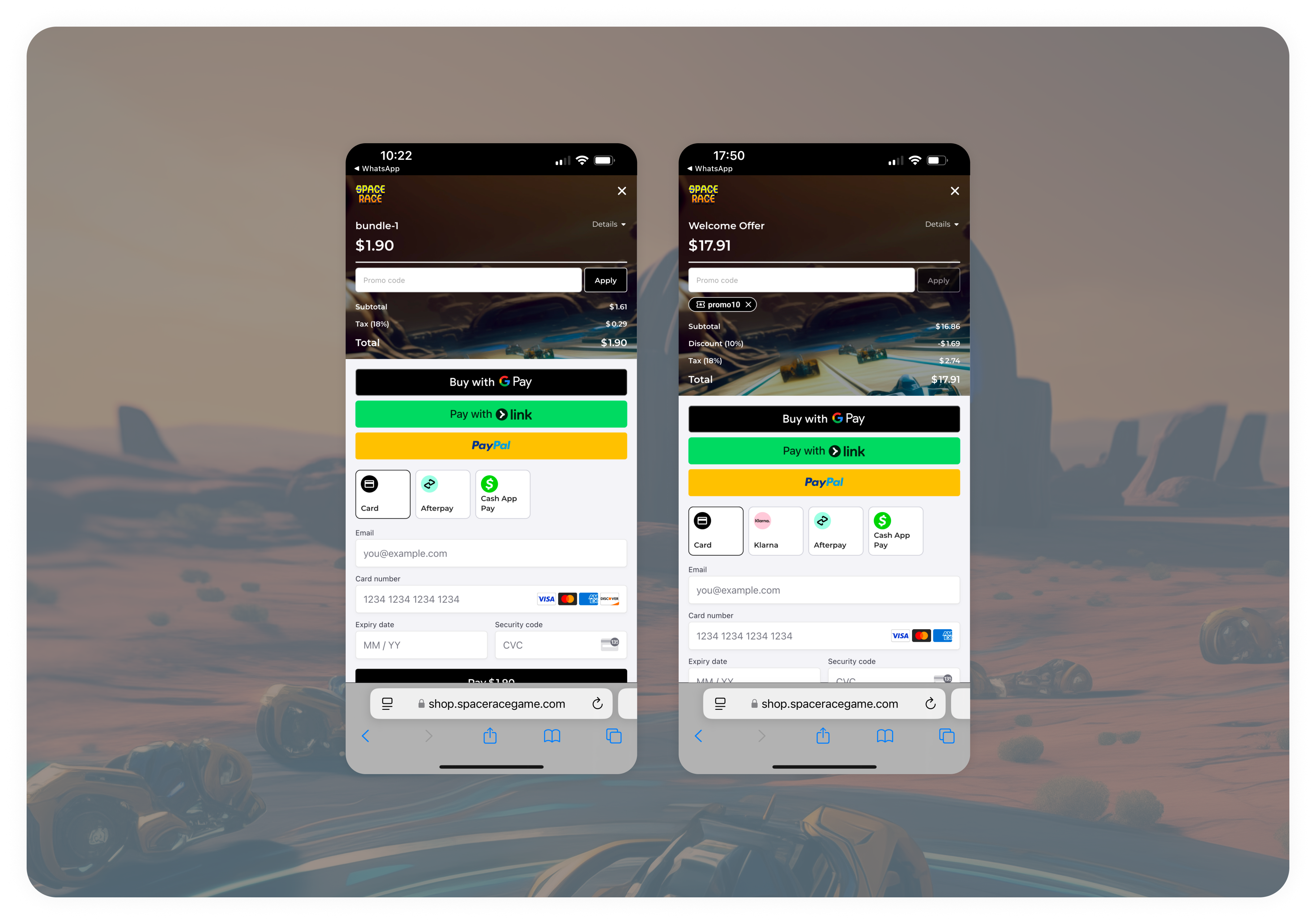 Skip to main contentThe Space Race game demo offers an interactive experience to see Appcharge in action. Explore a webstore that demonstrates the pixel perfect design our game UI experts deliver, ensuring players feel right at home the moment they land on your store.