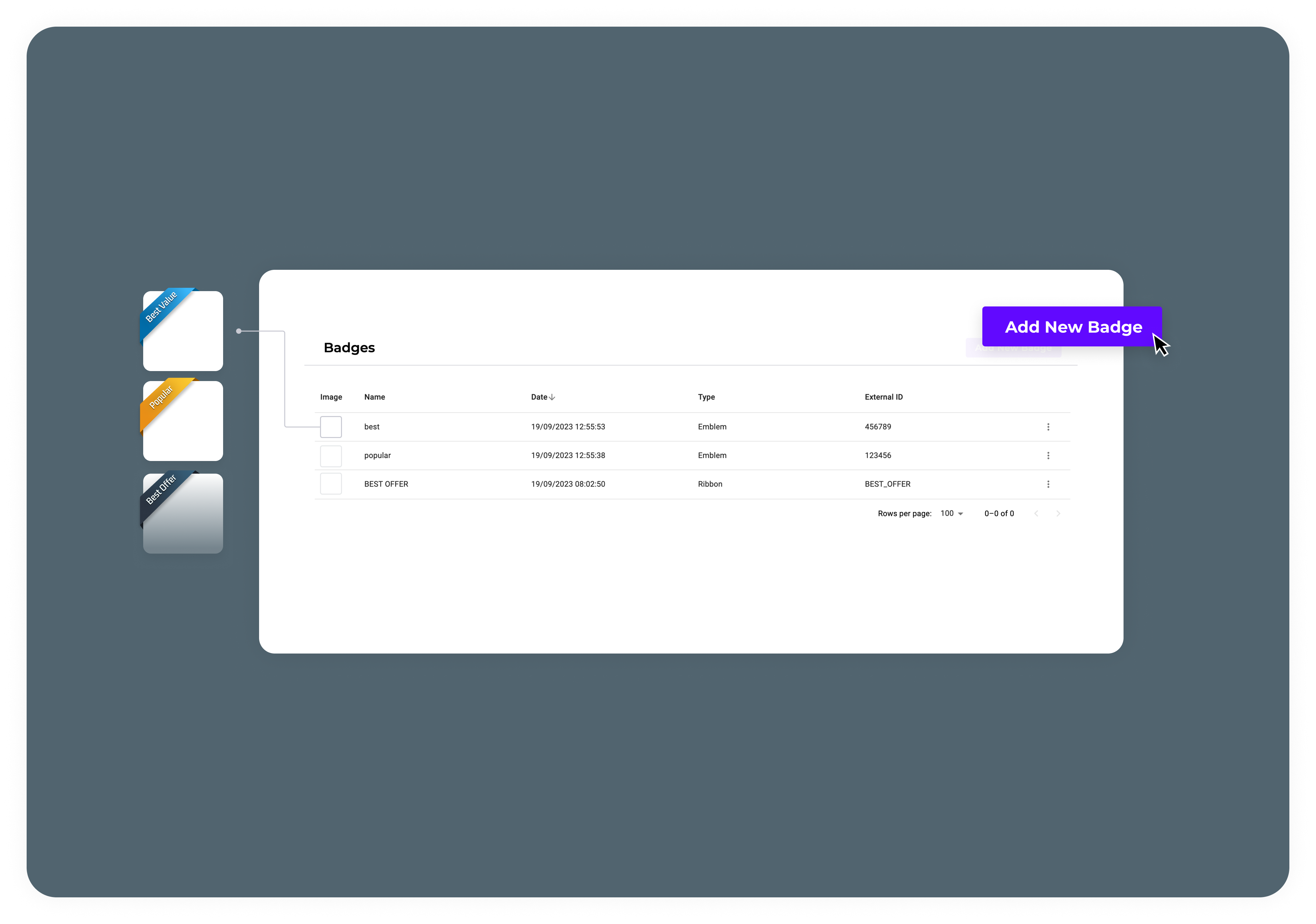 Type | Optional types: - Emblem: an external image - Ribbon: css format - colors and text can be controlled by the user |