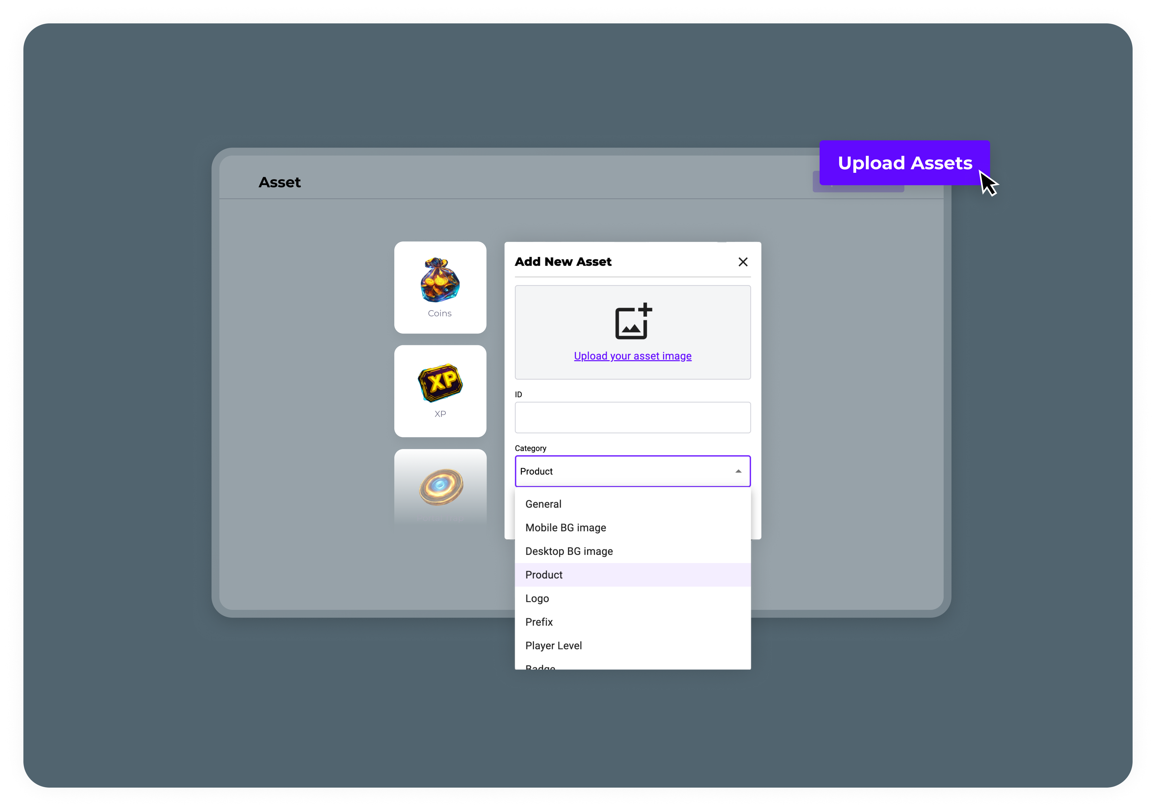 If you want to assign a specific ID to the product asset before using it, follow these steps to upload it via the Assets Library:- Navigate to the Assets Library tab in the Appcharge dashboard.