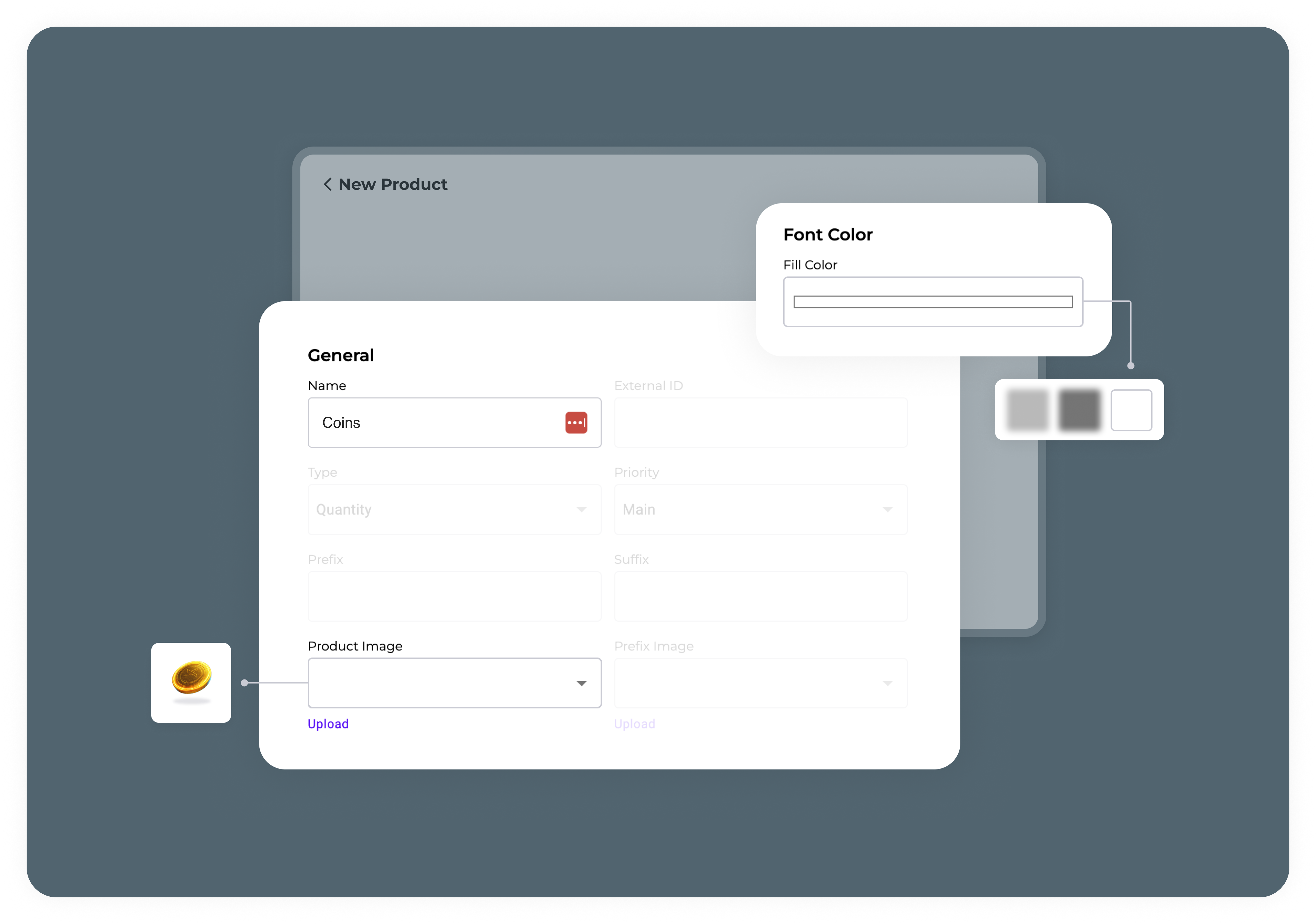 Products assets: Upload a Product Image and Prefix Image, or select one that you have already uploaded to the Assets Library and configured as a product.