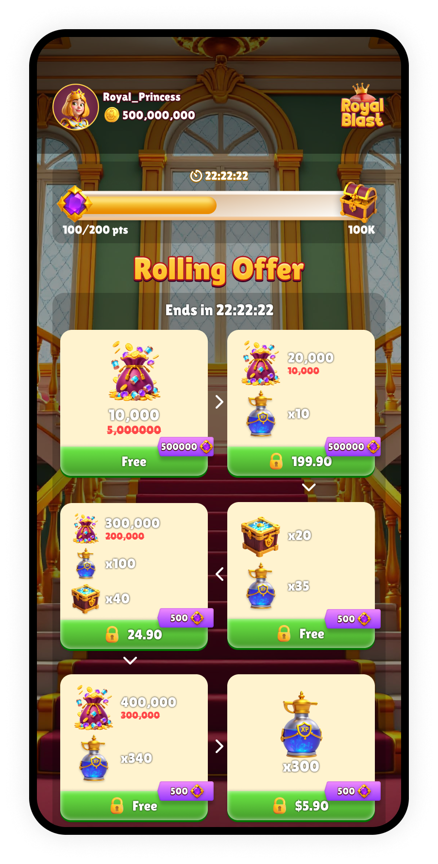 Rolling Offers unlock new sub-offers as players progress. Each offer reveals the next, motivating repeat interactions before the promotion resets. These time-sensitive offers are scheduled, with a countdown timer showing how long the current offer is active. If players don’t unlock all the offers before time runs out, the sequence resets.