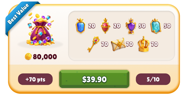 A type of offer that works alongside other offers to encourage players to purchase offers. A Progress Bar represents a mission with a defined number of points needed to earn a reward. Players earn points by purchasing other offers or collecting free rewards, and the bar fills to show their progress. When complete, they receive their reward, the bar resets, and they automatically advance to the next mission if available.