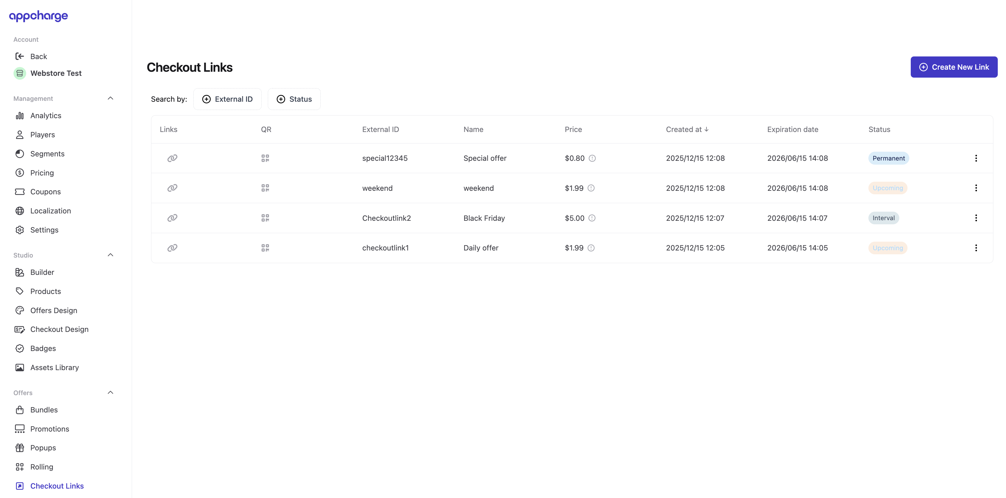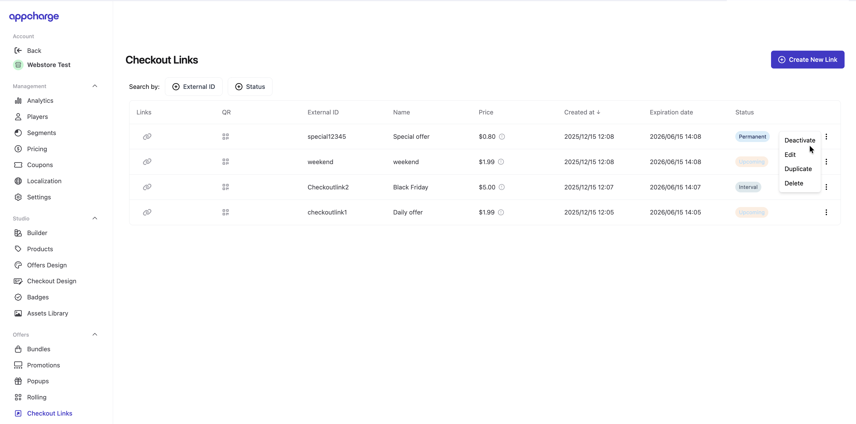 Return to the Checkout Links page and choose how you want to share the offer with players: