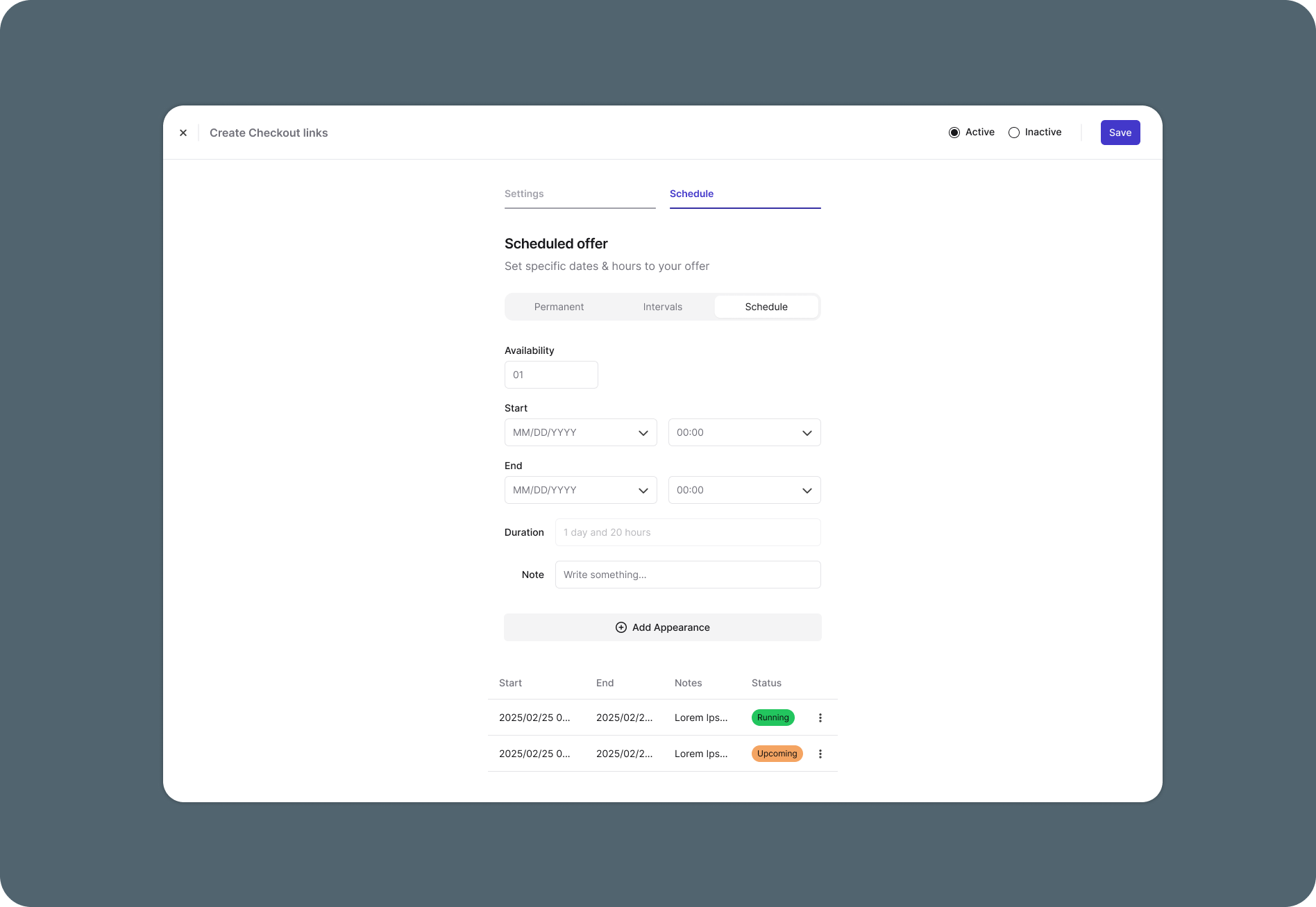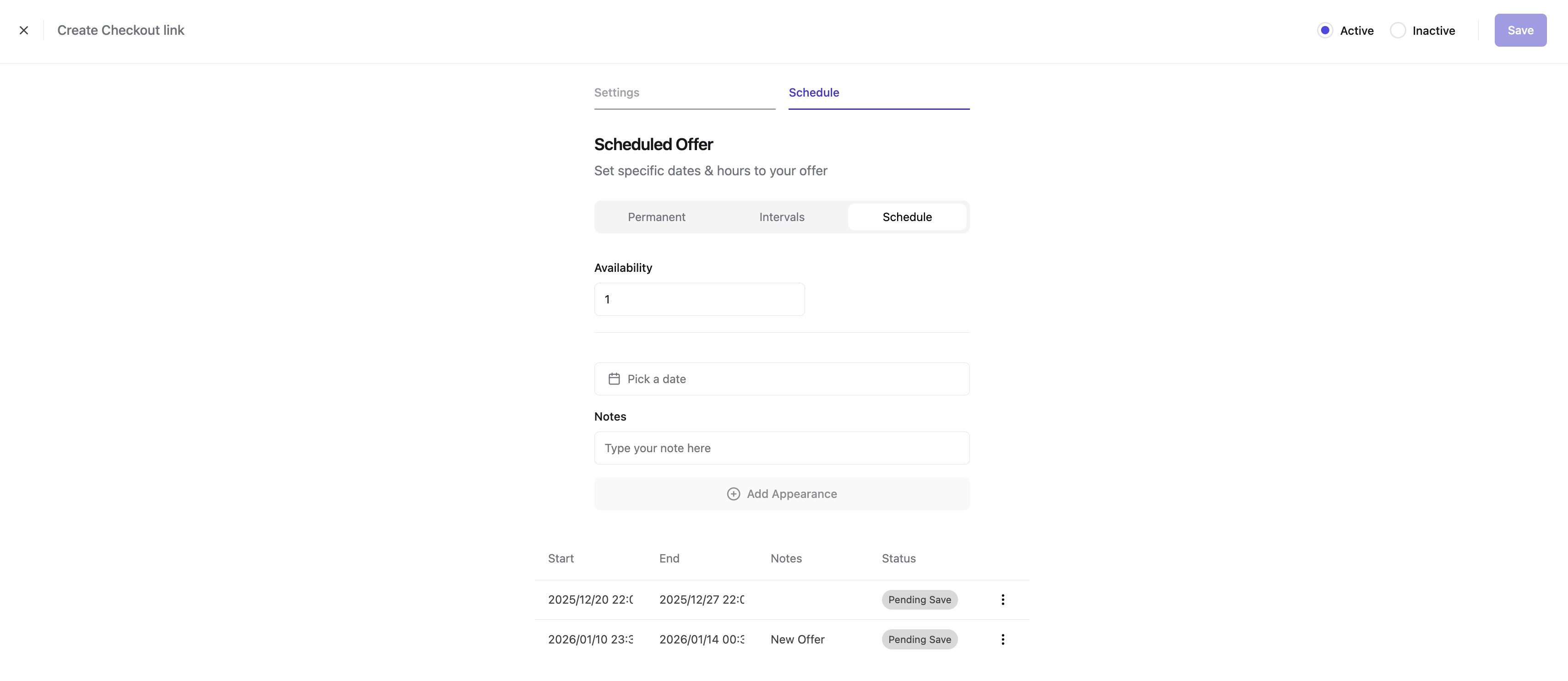 Go to the Schedule tab to manage when the checkout link offer is available and how often it can be purchased by each player. You’ll find three scheduling options: