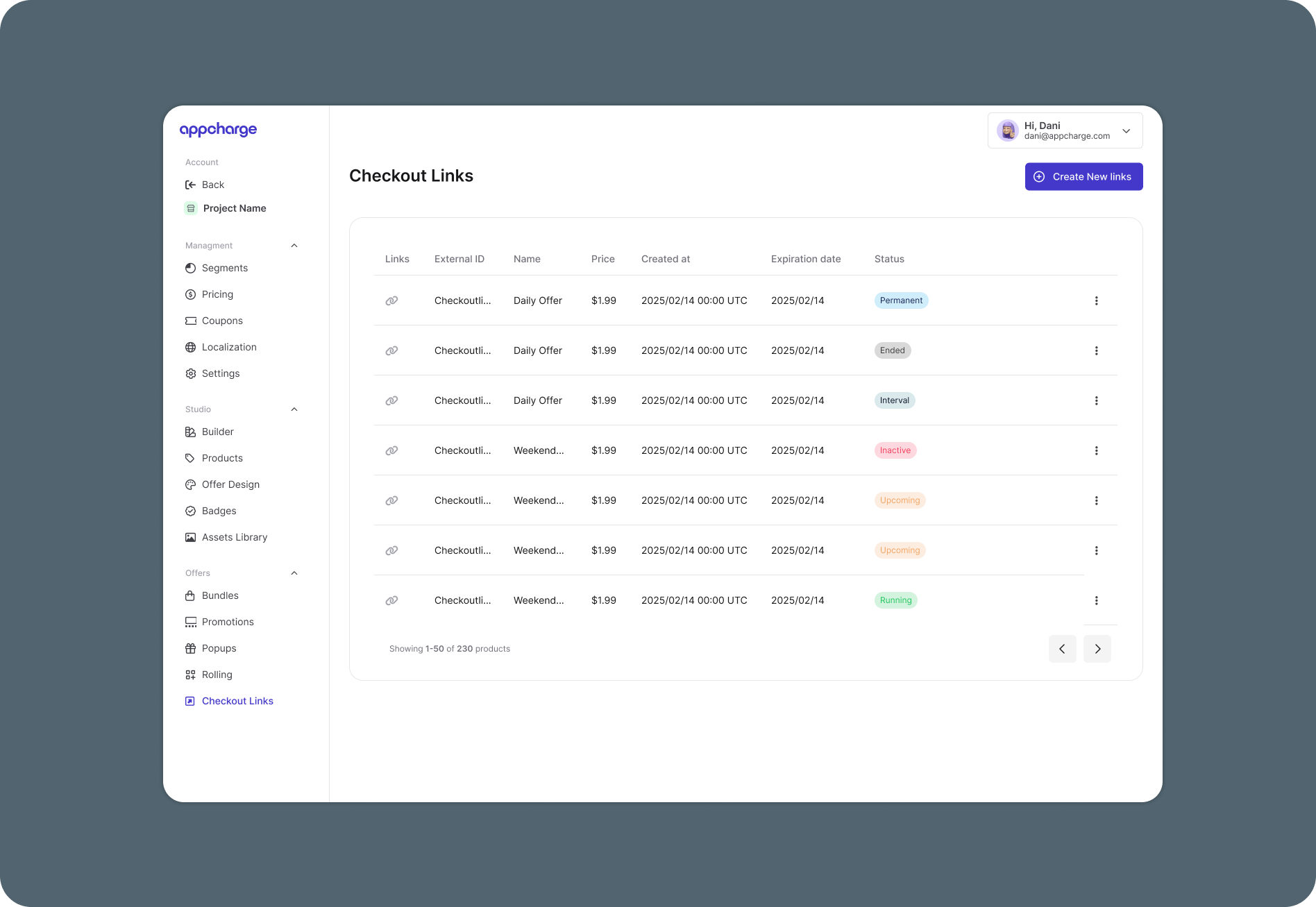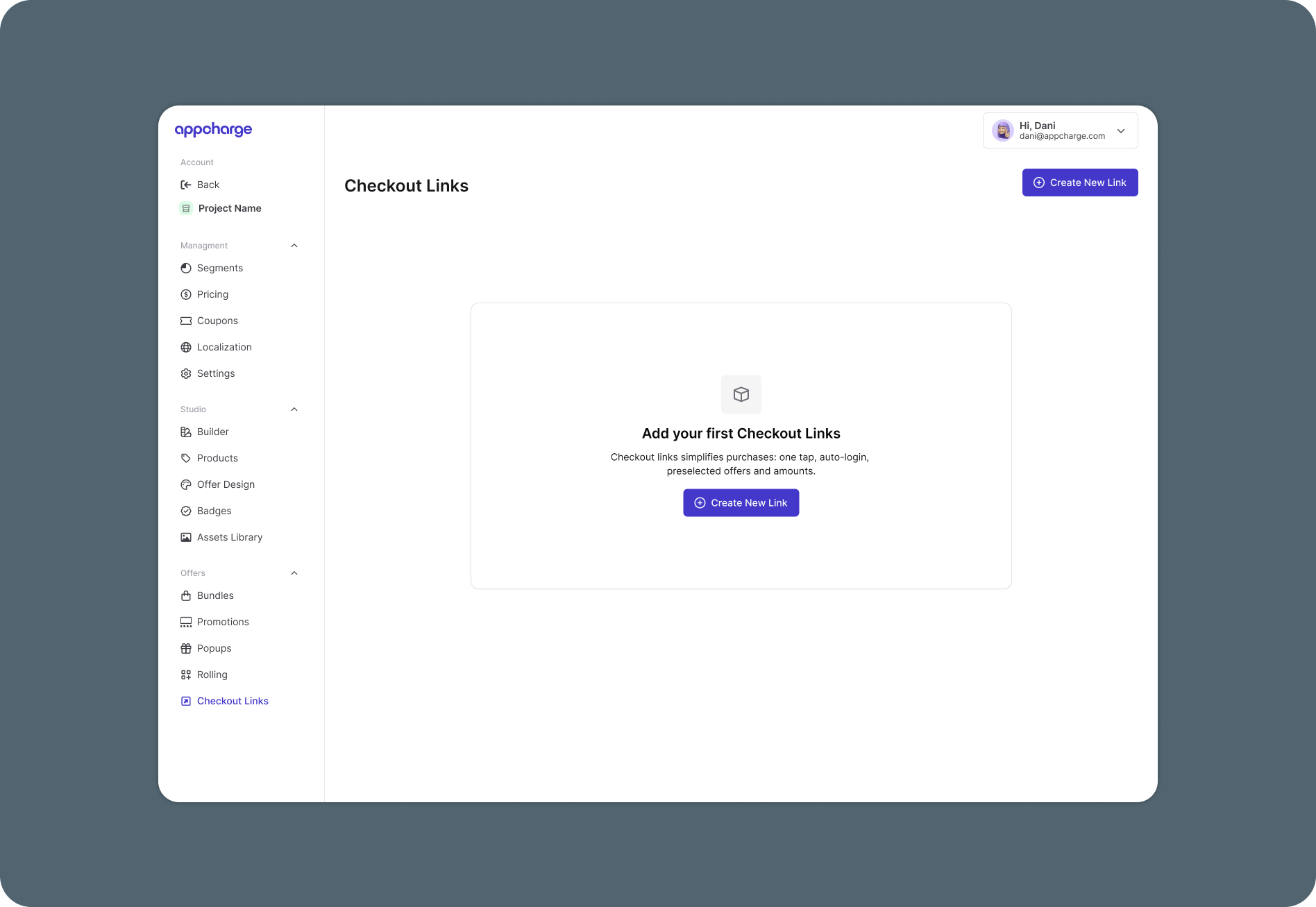 To create a checkout link offer:- Go to the Checkout Links tab and click Create New Link.