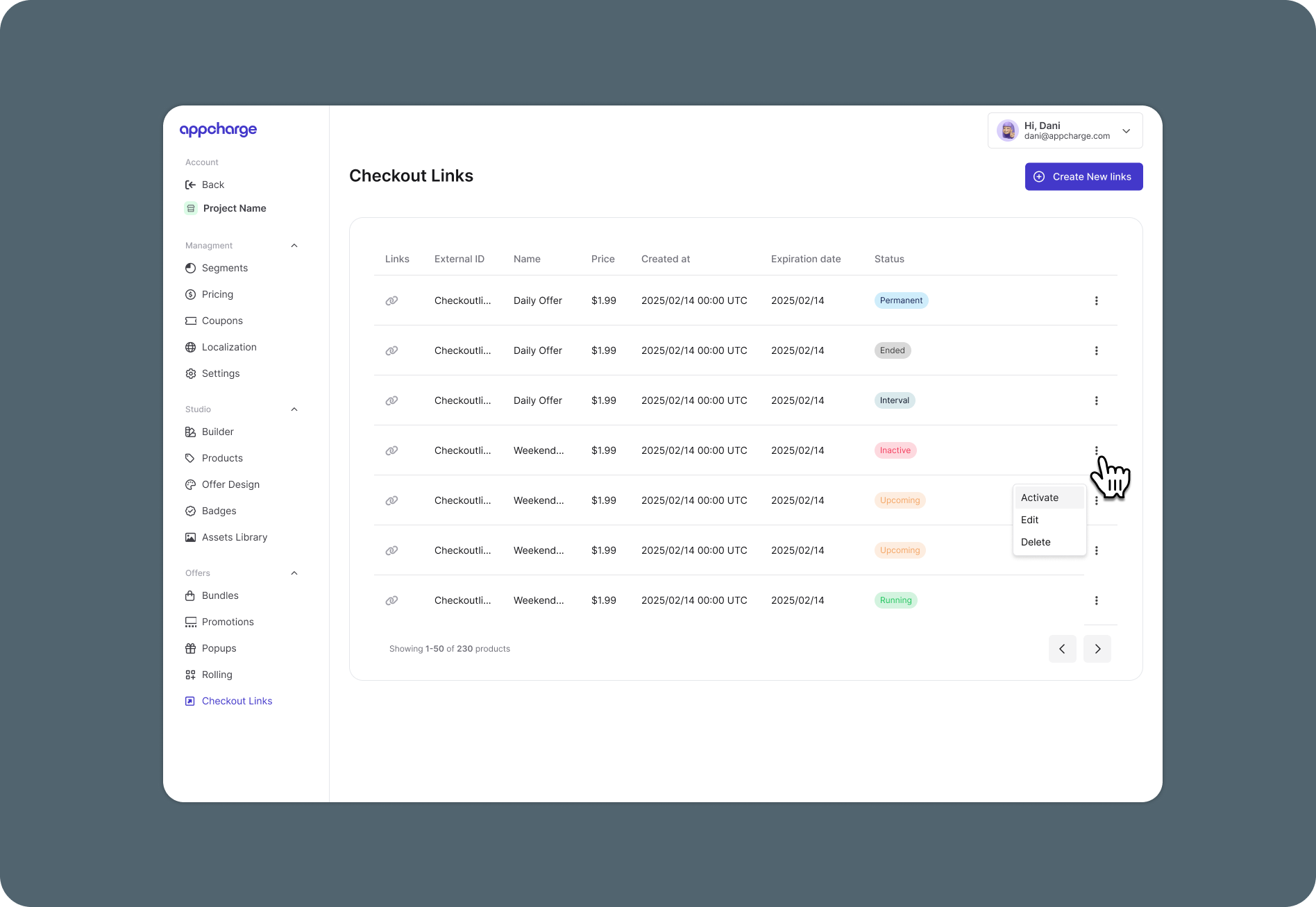 To activate or deactivate a checkout link offer:- Go to the Checkout Links tab.