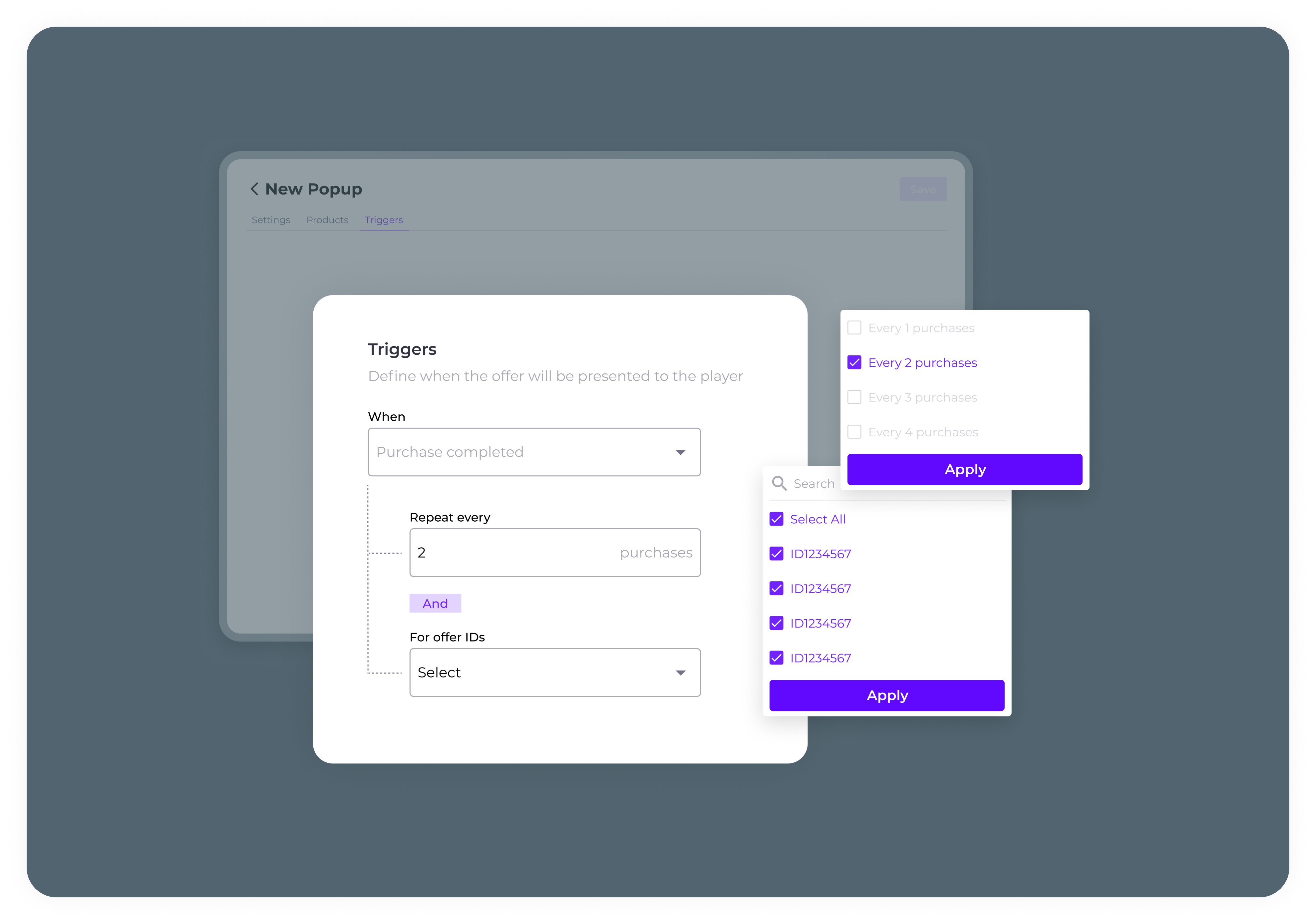 - Specific Offers Configured by Publisher (Using Offer External ID): Align offers with player actions or achievements to make each popup timely and relevant. This personalized approach boosts the value and appeal of deals, enhancing player satisfaction.