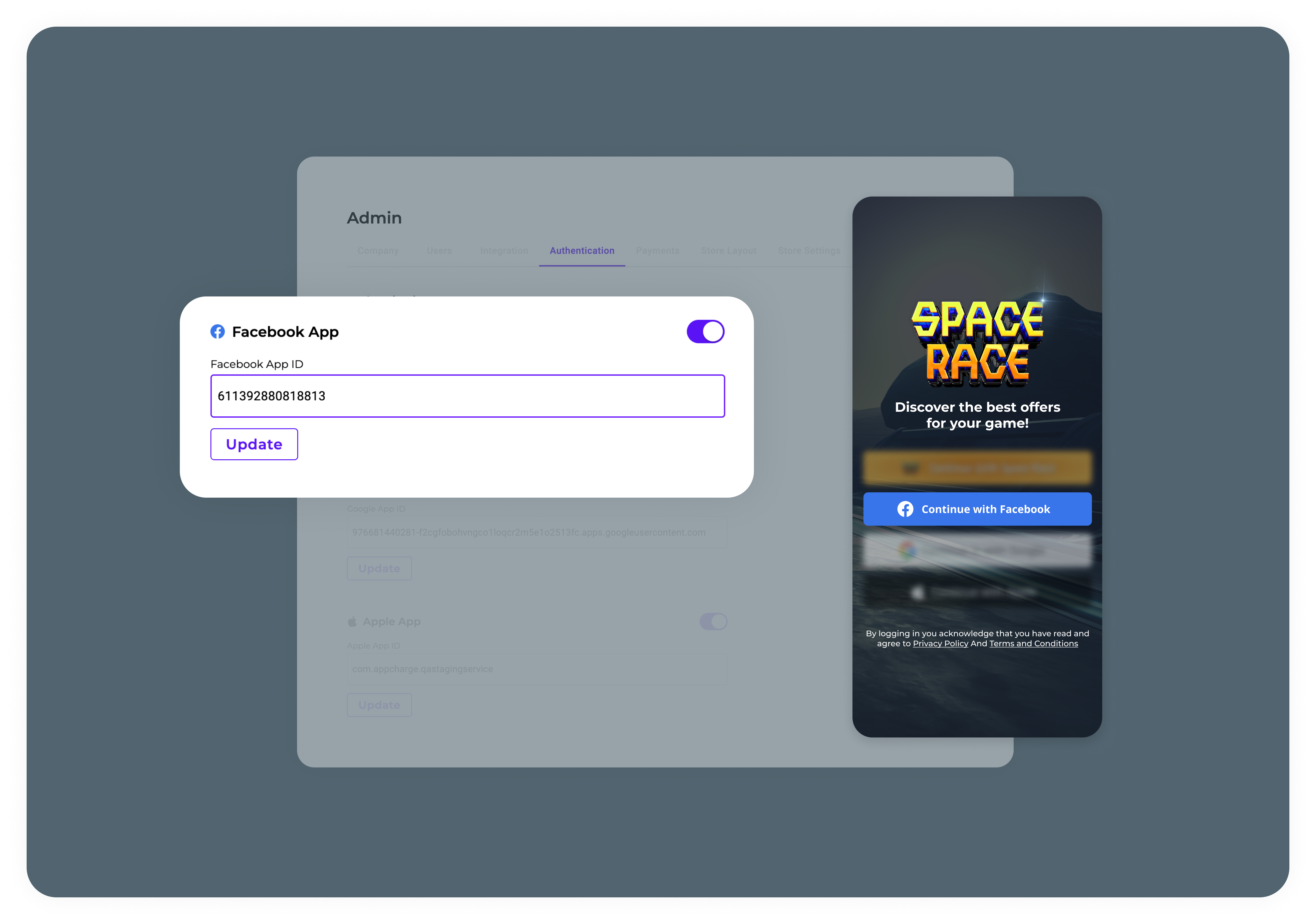 - Toggle on Facebook App, and enter your Facebook ID in the Facebook App ID field.